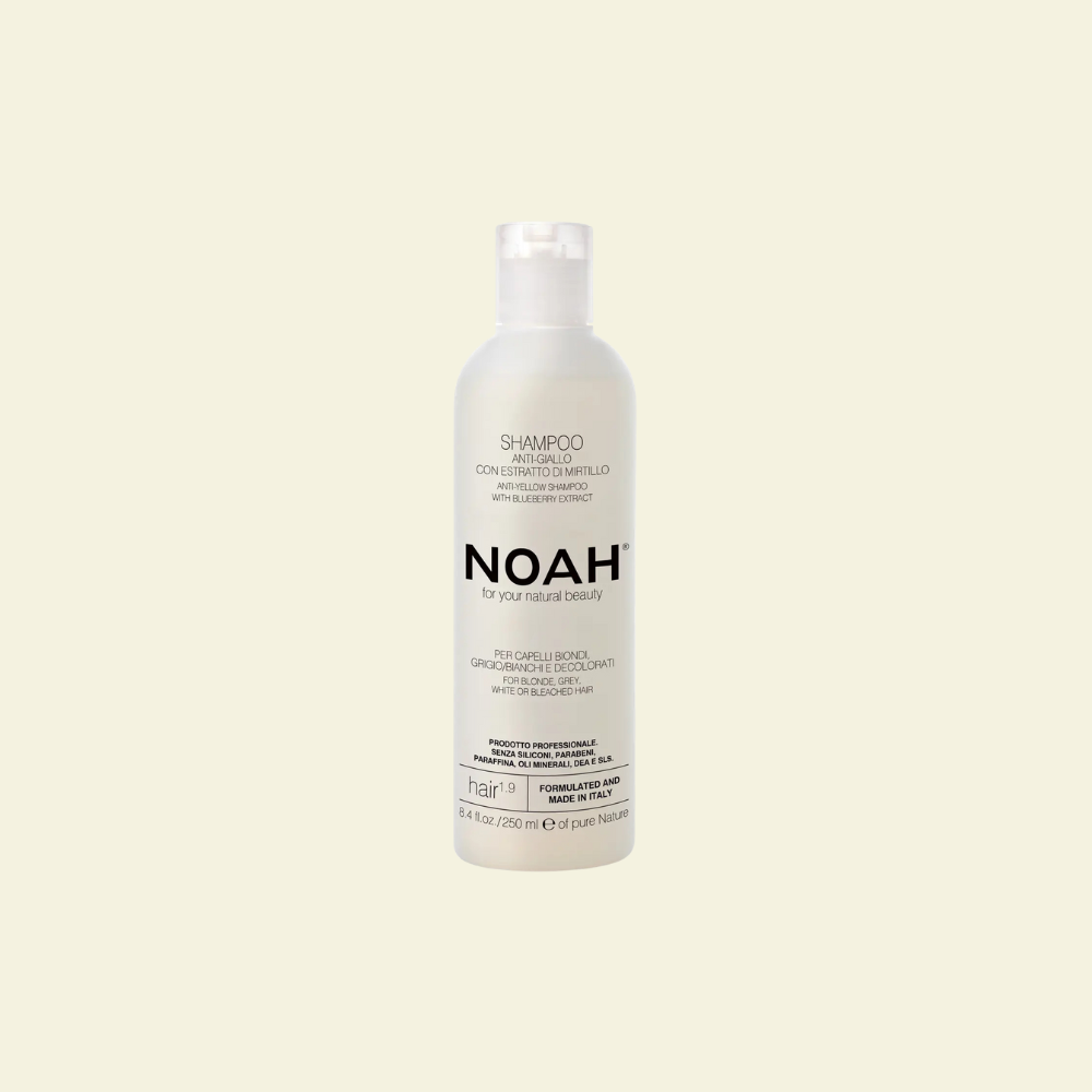 El Champú Antiamarillo con Extracto de Arándano Azul (1.9) de Noah es un champú específico para cabellos rubios, blancos, grises o decolorados. Formulado para neutralizar los reflejos amarillos no deseados, limpia suavemente el cuero cabelludo y devuelve al cabello su tono frío y luminoso. Su uso regular mantiene el color vibrante, aporta suavidad y volumen, y mejora el aspecto general del cabello. Para un resultado más intenso, se recomienda combinarlo con la Mascarilla Capilar Antiamarillo.