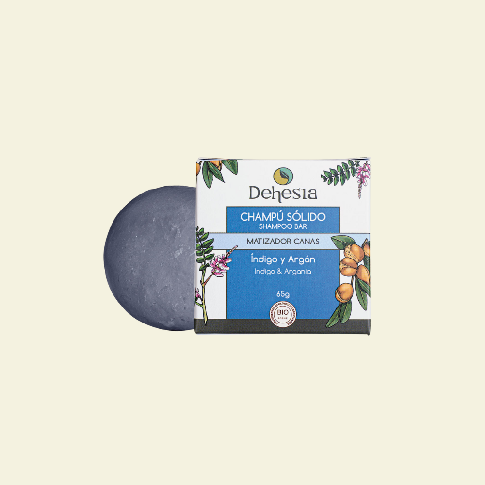 El Champú Solido BIO con Índigo y Argán de Dehesia para cabellos blancos, grises o con mechas rubias es un champú azul en formato sólido elaborado artesanalmente con polvo de índigo, aceites vegetales y extractos botánicos nutritivos para ayudar a mejorar el color y eliminar los reflejos amarillentos. Una fórmula natural y vegana, certificada ecológica, sin sulfatos ni parabenos ni ningún ingrediente de origen sintético. Su color azul se debe al polvo de índigo natural.