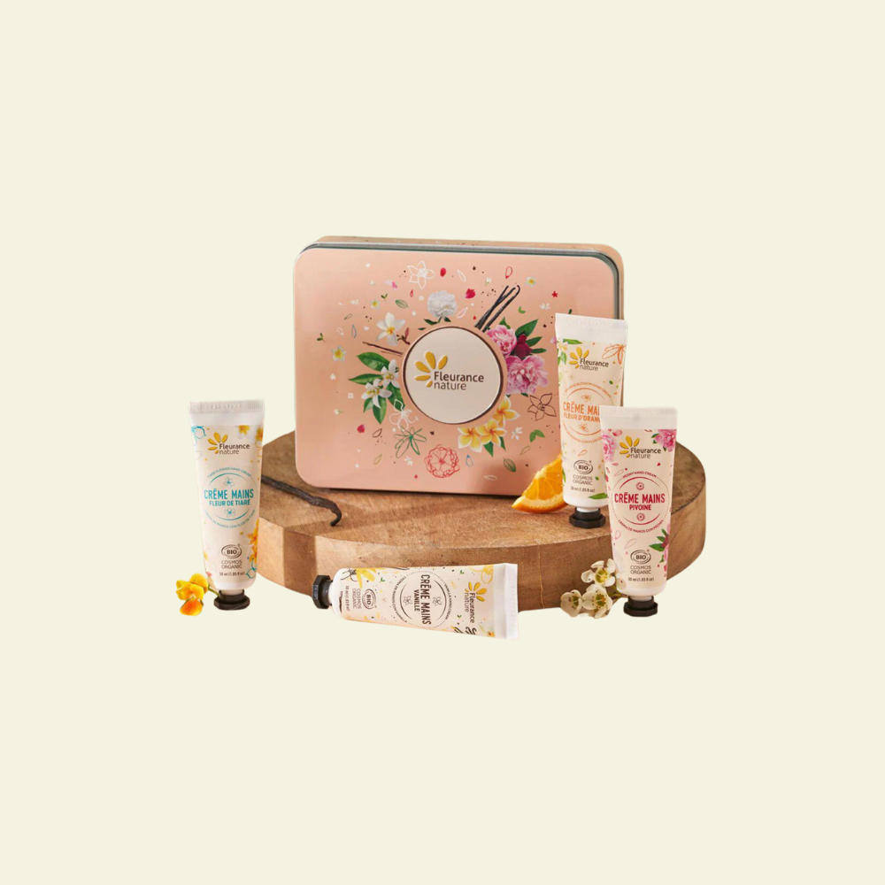 Esta bonita caja de metal retoma el diseño floral y colorido de cada una de las 4 cremas aromáticas que contiene. Es ideal para regalar.