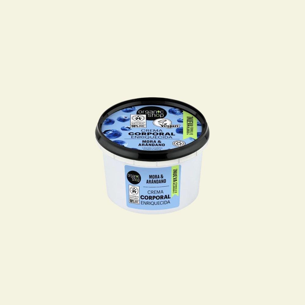 La Crema Corporal Enriquecida con Mora y Arándanos de Organic Shop es una crema corporal intensamente nutritiva, con un 99% de ingredientes de origen natural. Su fórmula vegana, rica y de rápida absorción, hidrata en profundidad y deja la piel suave, elástica y visiblemente más fresca. Su aroma afrutado y natural convierte cada aplicación en un momento de cuidado placentero.