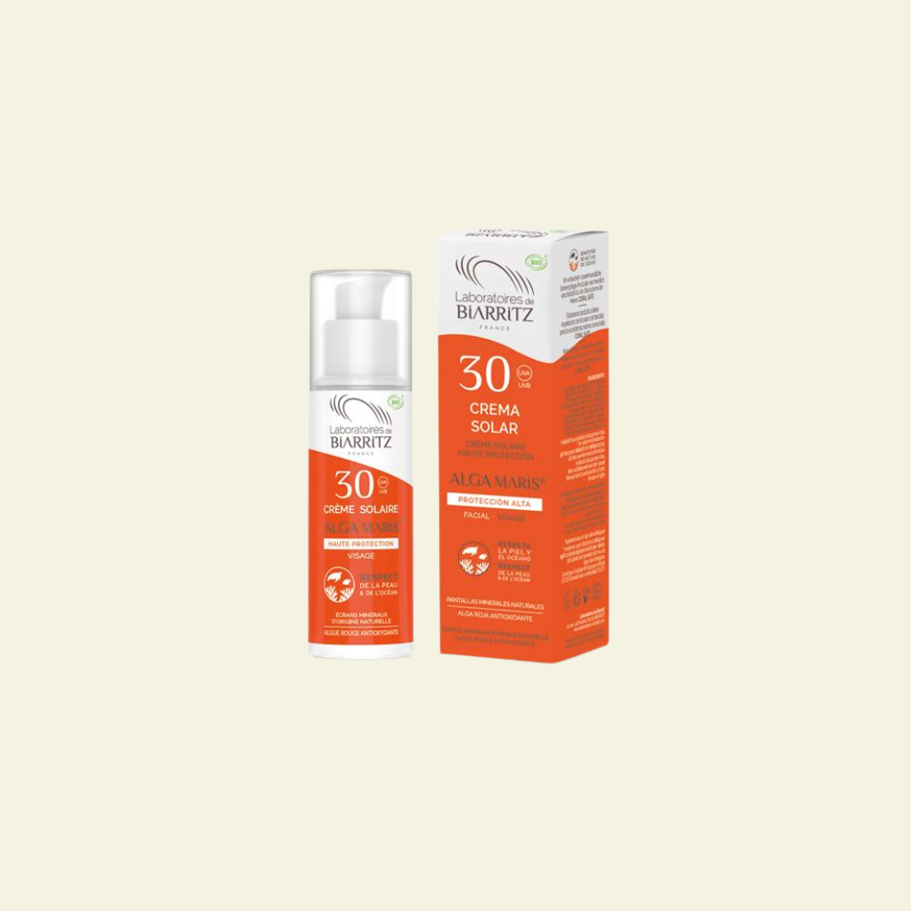 La Crema Solar Facial SPF30 de Laboratorios Biarritz es un tratamiento versátil que es a la vez protector e hidratante. El protector solar facial orgánico SPF50 protege inmediatamente contra las radiaciones UVA/UVB gracias a la combinación única de pantallas minerales y Alga-Gorria®, un extracto antioxidante patentado de algas rojas de la costa vasca, que previene notablemente el envejecimiento de la piel. Enriquecido con aloe vera orgánico, conocido por sus propiedades hidratantes y calmantes. Su fórmula protege eficazmente contra los efectos nocivos del sol y preserva el medio marino gracias a una fórmula comprometida. Este protector solar deja en la piel una delicada nota perfumada de coco y karité.