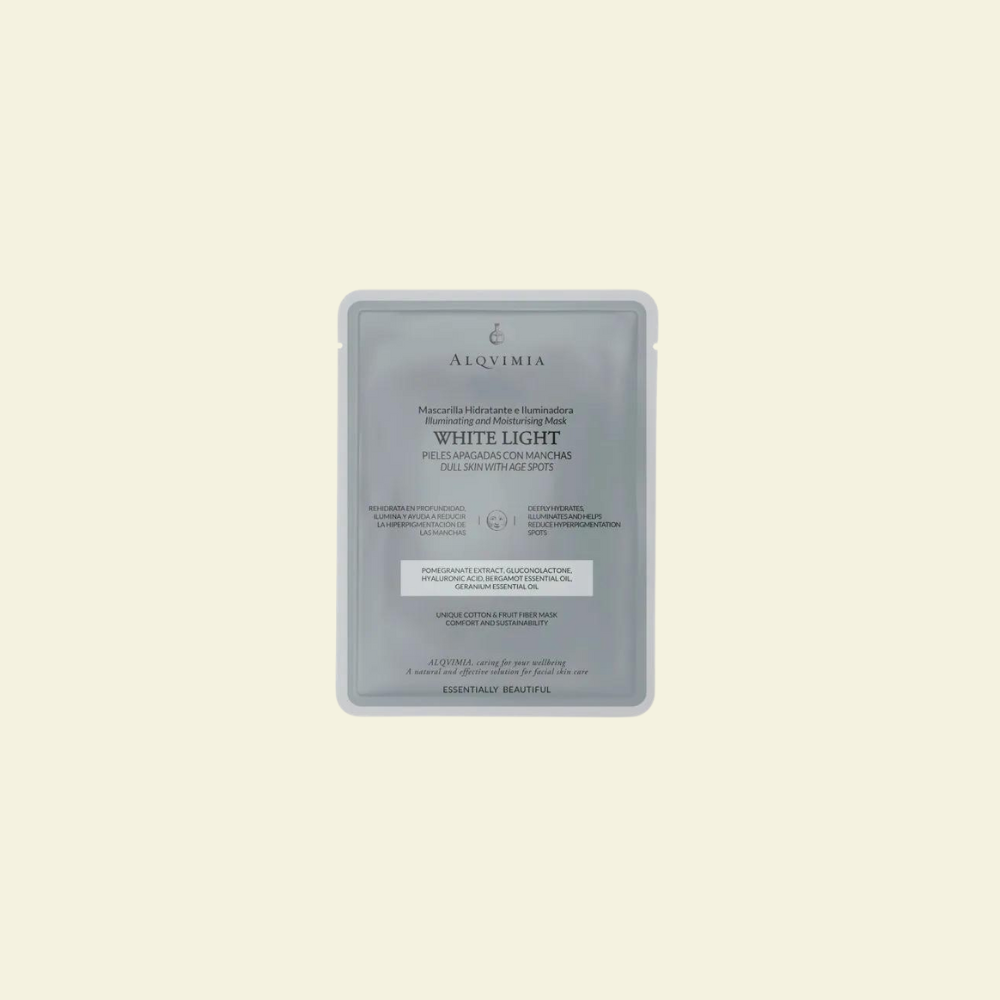 La Mascarilla Facial Iluminadora White Light de Alqvimia está hecha con un innovador tejido ultra fino impregnado con un sérum concentrado en activos iluminadores especialmente indicados para el cuidado de pieles apagadas y/o con manchas. Está además enriquecida con la sinergia de Aceites Esenciales de Limón, Naranja, Petitgrain, Mandarina, Pomelo, Bergamota y Geranio cuyas propiedades dermoprotectoras y despigmentantes favorecen el efecto despigmentante y el aporte de luminosidad natural para un cutis resplandeciente.