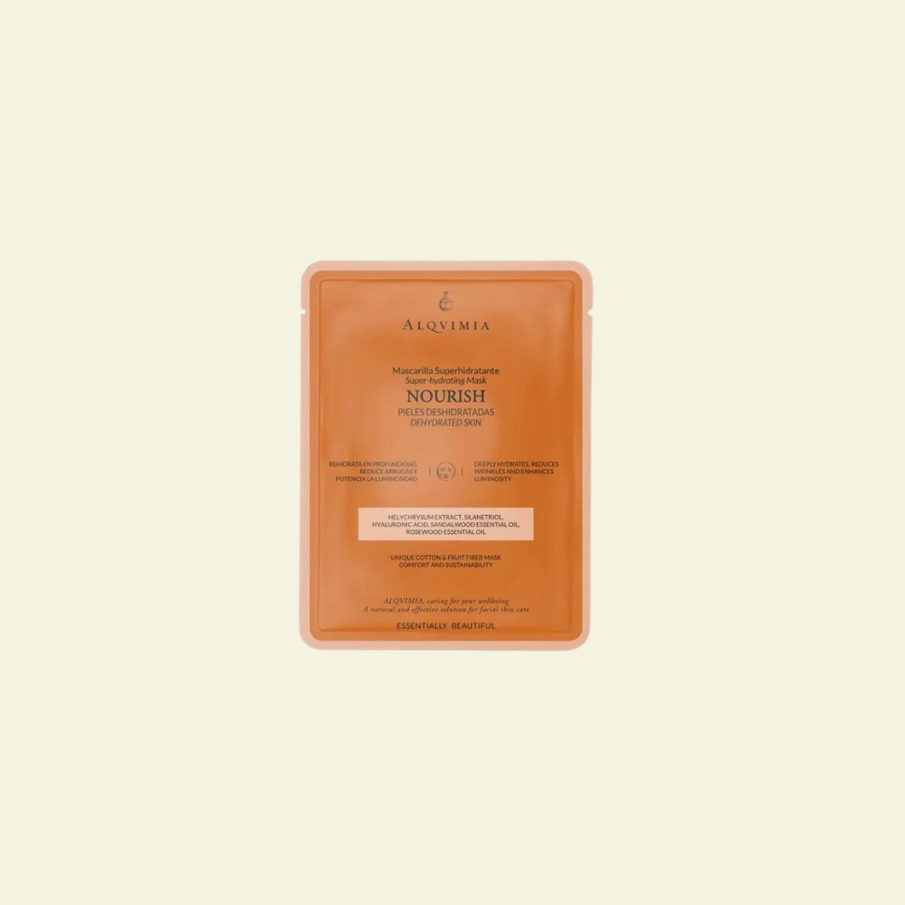 La Mascarilla Facial Superhidratante Nourish de Alqvimia está hecha con un innovador tejido ultra fino impregnado con un sérum concentrado en activos hidratantes especialmente indicados para el cuidado de pieles secas y muy castigadas. Está demás enriquecida con la sinergia de Aceites Esenciales de Limón, Naranja, Manzanilla, Incienso, Palo de Rosa y Sándalo cuyas propiedades hidratantes y nutritivas previenen la pérdida de agua de la piel para el tratamiento de las pieles secas y deshidratadas.