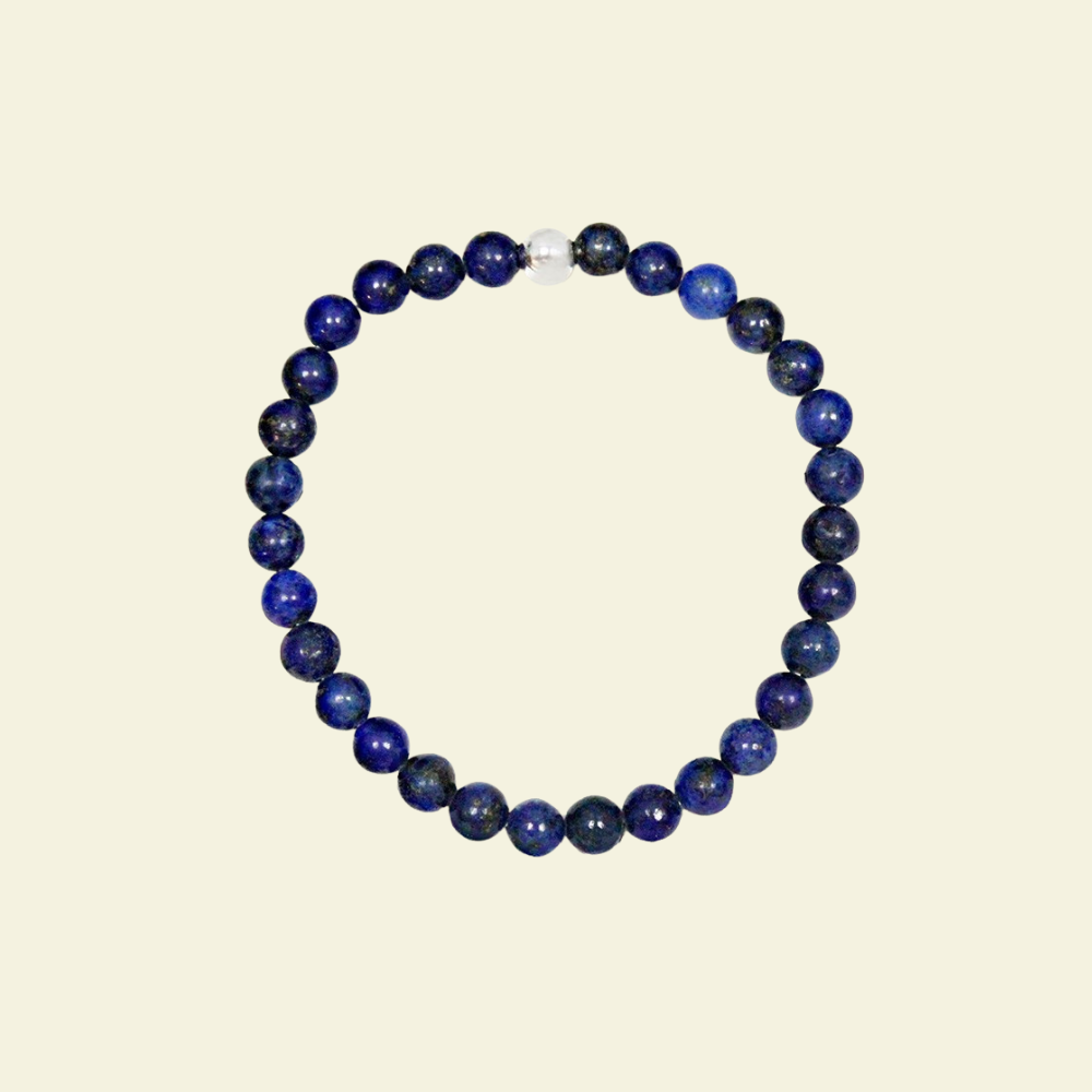 Esta pulsera, elaborada con piedras naturales de lapislázuli de 6 mm, está diseñada en torno a una delicada perla de plata que realza su sofisticación. El lapislázuli, una gema venerada desde la antigüedad, simboliza la sabiduría, la intuición y la conexión espiritual.