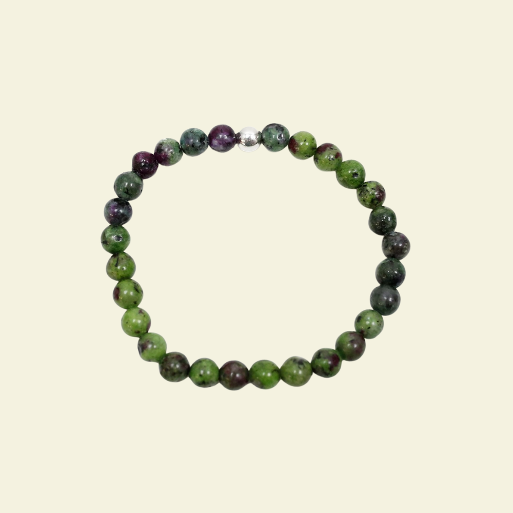 Esta sofisticada pulsera, confeccionada con piedras naturales de rubí zoisita de 6 mm, destaca por su diseño refinado, realzado con una delicada perla de plata. El rubí zoisita es una gema única que combina de manera natural tonalidades verdes y rosas, creando un equilibrio perfecto entre energía vibrante y serenidad visual.