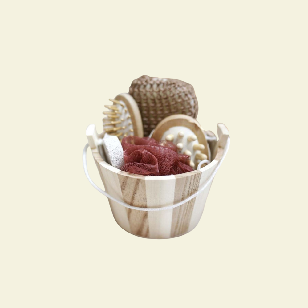 Disfruta de una experiencia de spa en casa con este completo set de baño. Presentado en una encantadora cesta de madera con cuerda, este set incluye todo lo necesario para mimar y cuidar tu piel: