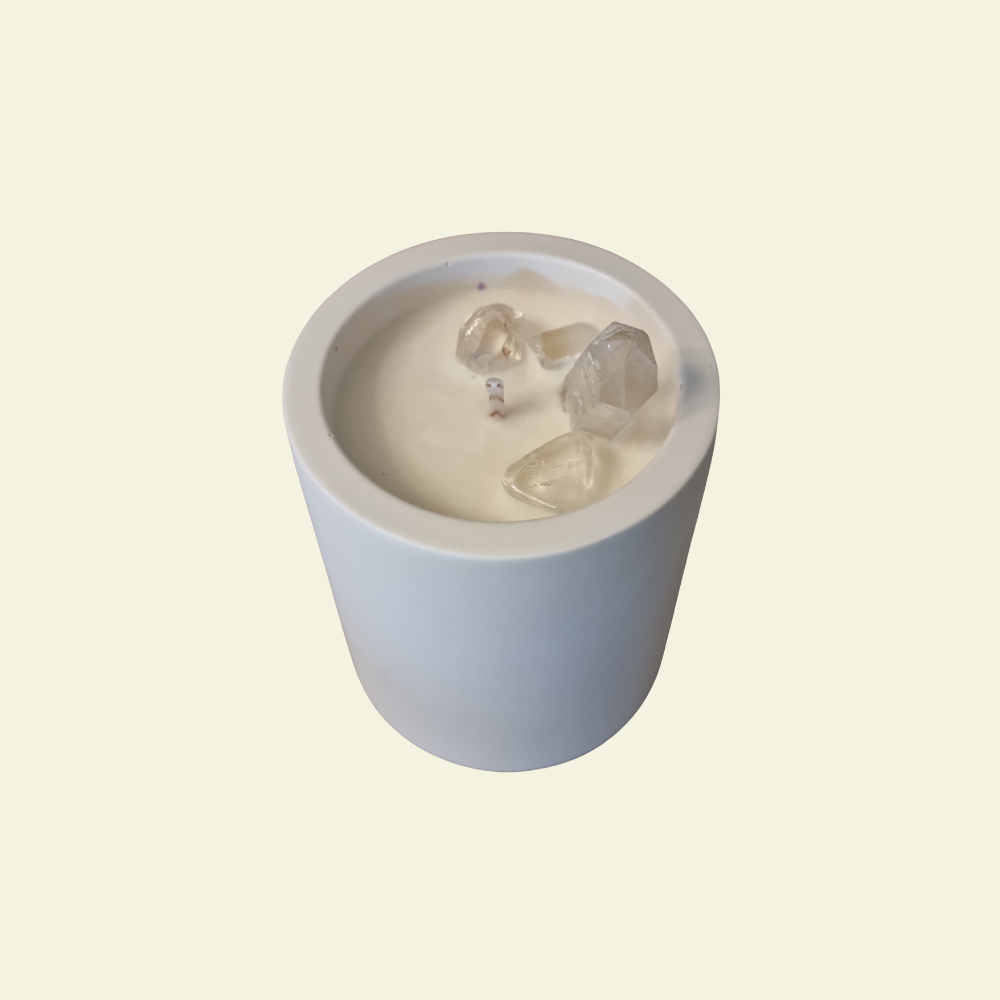Las piedras que acompañan a esta vela son el cuarzo cristal y el cuarzo maestro. El cuarzo cristal es una de las piedras más versátiles que potencia las vibraciones positivas y neutraliza las negativas. Es ideal para revitalizar el cuerpo y la mente, proporcionando un impulso de energía cuando se necesita. Está apoyado por el cuarzo maestro que es una variante altamente potente del cuarzo conocida por amplificar la energía positiva y promover la armonía.